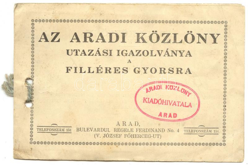 1932 Az aradi közlöny utazási igazolványa a filléres gyorsra https://www.darabanth.com/de/166-Fernauktion/166.0/Andere-Sammelgebiete/Drucksachen~500023/1932-Az-aradi-kozlony-utazasi-igazolvanya-a-filleres-gyorsra~II539862