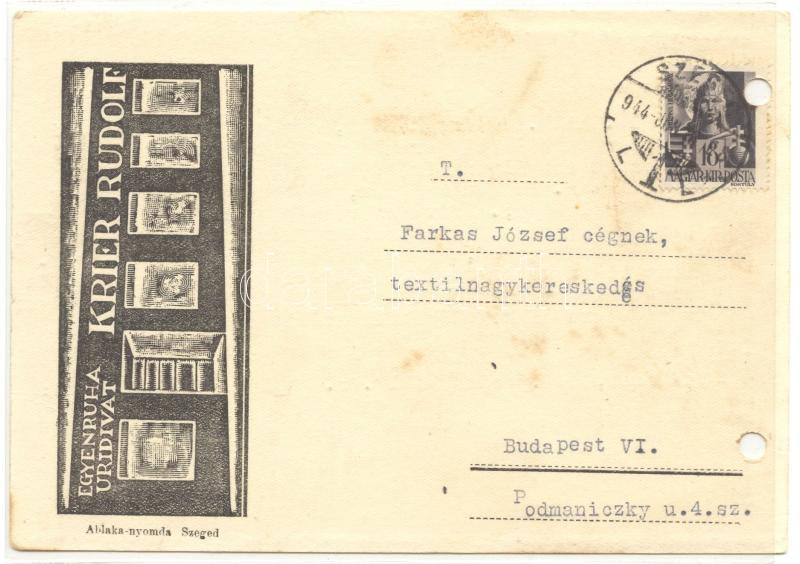 Szegedi Krier Rudolf divatáruházának nyílt levelezőlapja (jobb oldalon... https://www.darabanth.com/de/166-Fernauktion/166.0/Andere-Sammelgebiete/Drucksachen~500023/Szegedi-Krier-Rudolf-divataruhazanak-nyilt-levelezolapja-jobb-oldalon-lyukasztassal~II549311