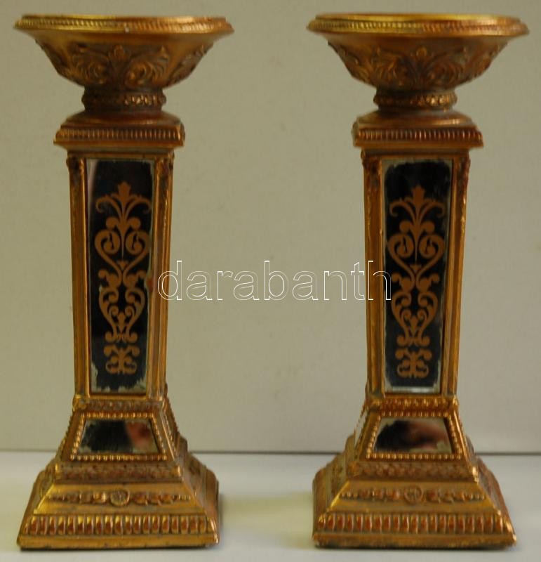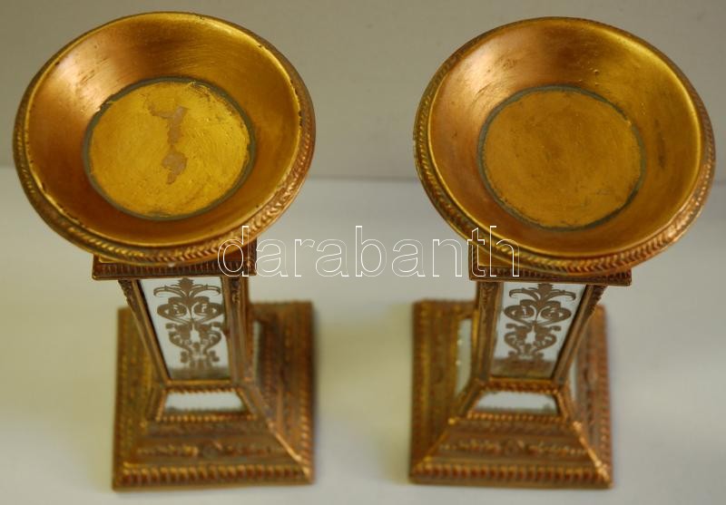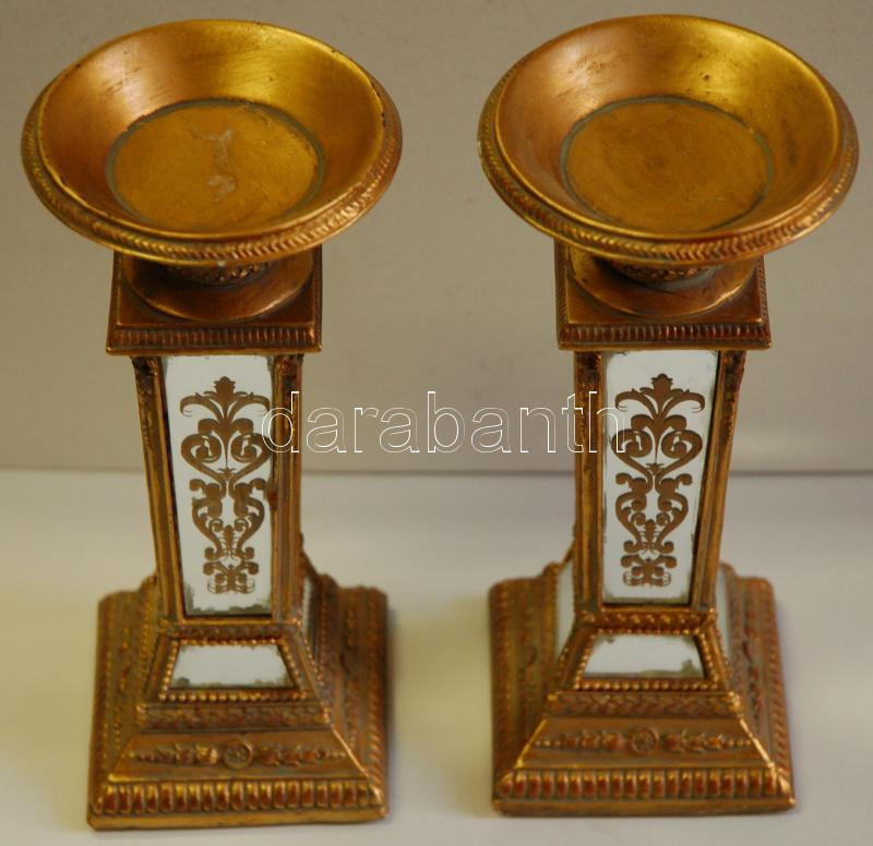 Bronzírozott gipsz mécsestartó pár festett tükörbetéttel (kis lepattogzásokkal, az egyiken javítás nyomaival) /