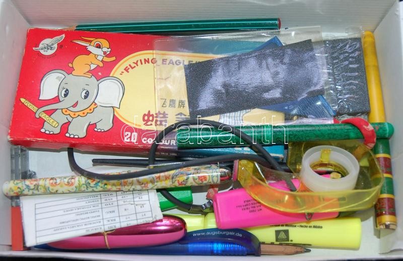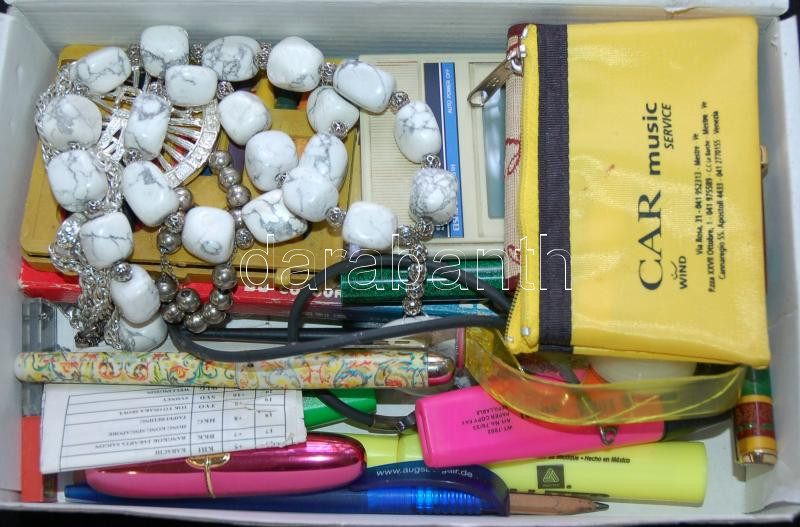Beschreibung: Kis bolha tétel: nyakláncok,számológép, tollak, hegyező, telefonregiszter, pénztárca, zsírkréták, stb.