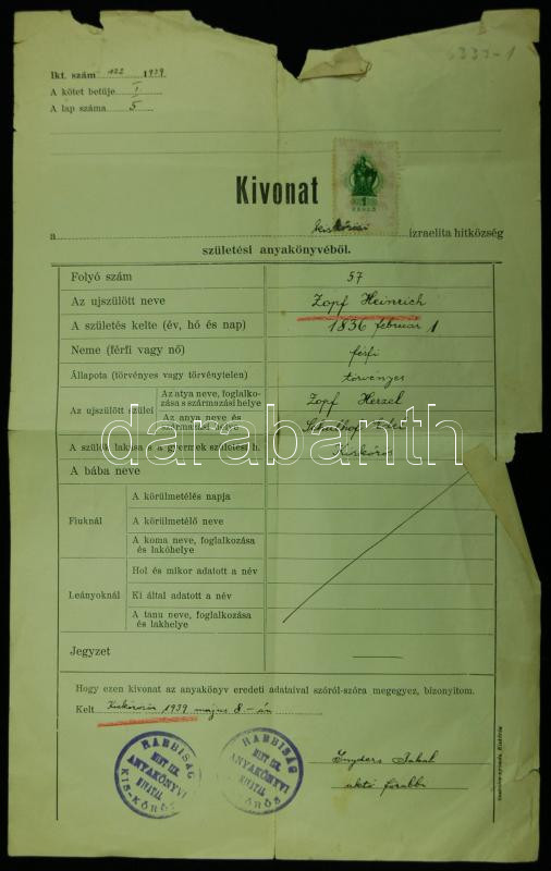Beschreibung: 1939 Kivonat a kiskőrösi izraelita hitközség születési anyakönyvéből a hitközség pecsétjével és Synders Jakab főrabbi anyakönyvvezető rabbi aláírásával