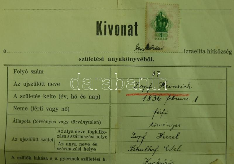 1939 Kivonat a kiskőrösi izraelita hitközség születési anyakönyvéből a... https://www.darabanth.com/de/166-Fernauktion/166.0/Andere-Sammelgebiete/Judaica~500019/1939-Kivonat-a-kiskorosi-izraelita-hitkozseg-szuletesi-anyakonyvebol-a-hitkozseg-pecsetj~II549307