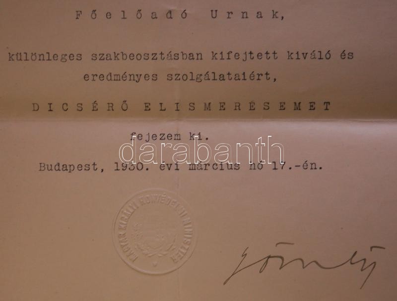 Beschreibung: 1930 Gömbös Gyula hadügyminiszter aláírása oklevélen
