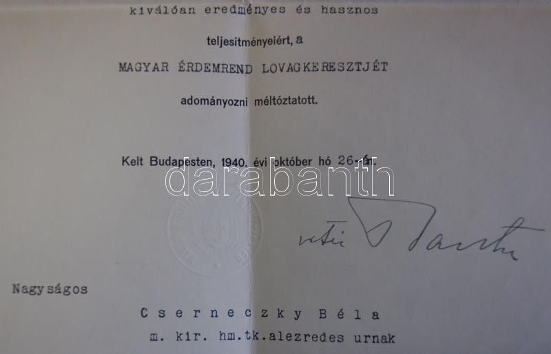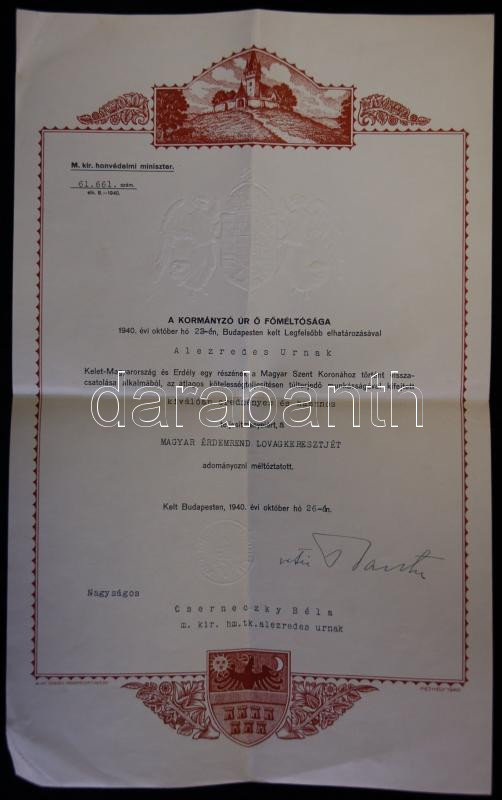 Beschreibung: 1940 Magyar Érdemrend Lovagkereszt emléklap vitéz Bartha Károly honvédelmi miniszter aláírásával