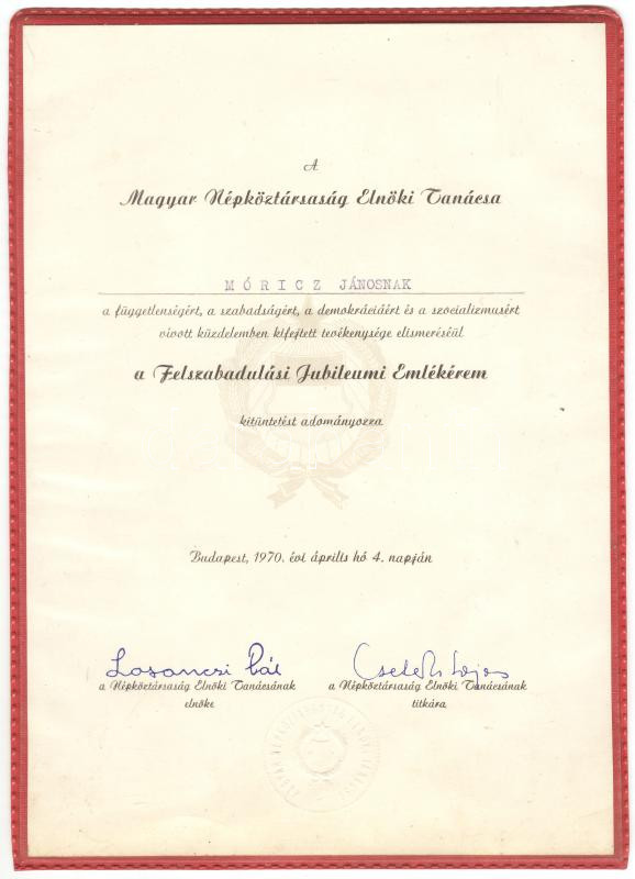 Beschreibung: 1970 Losonczi Pál a Népköztársaság Elnöki Tanácsnak elnökének aláírása emléklapon