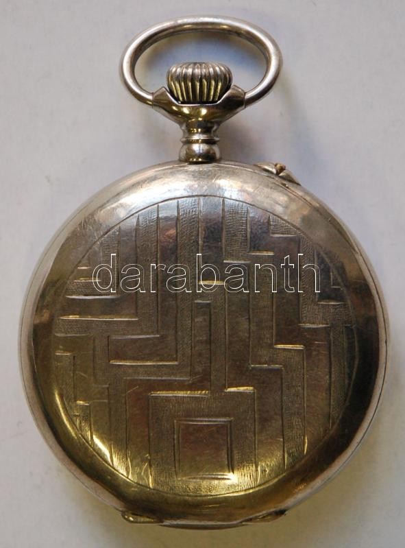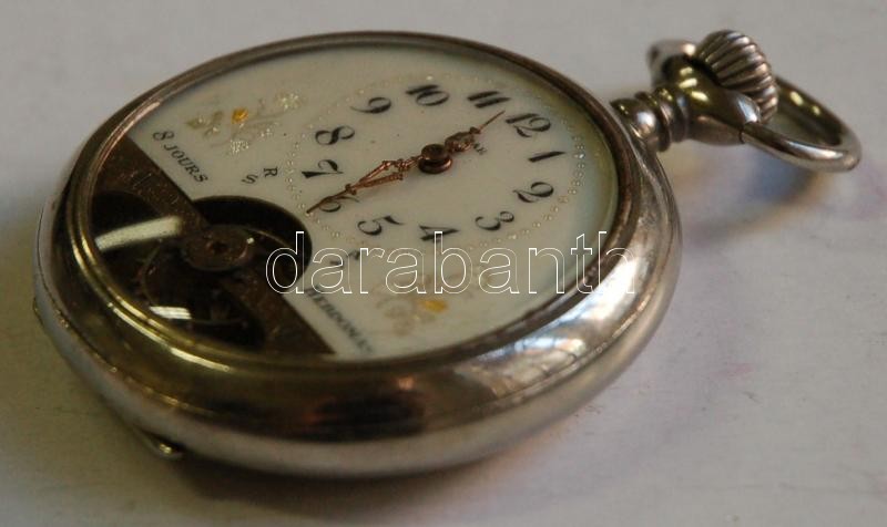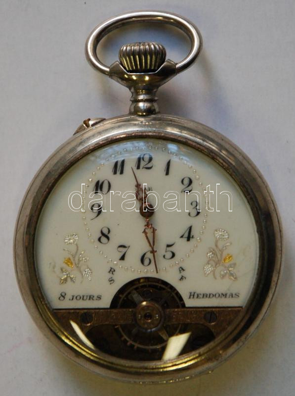 cca 1920 Hebdomas 8 napos, különleges rugós szerkezetű zsebóra, festett porcelán számlappal, előre nyitott billegőhíddal, geometrikus díszítésű hátlappal, kiválóan működik (a számlapon alig látható hajszálrepedések) /