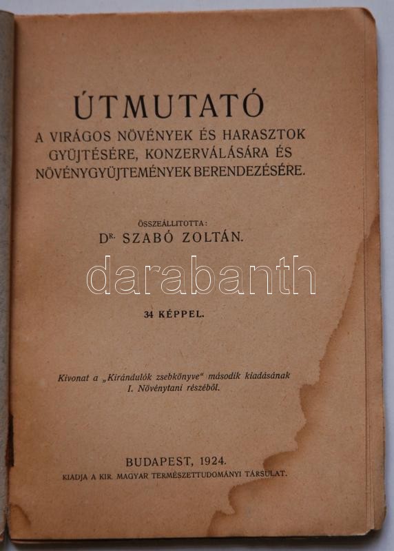 Dr. Szabó Zoltán: Útmutató a virágos növények és harasztok gyűjtésére, konzerválására és növénygyűjtemények berendezésére, Bp., 1924, kiadja a Királyi Magyar Természettudományi Társulat, papírkötés, a szövegben 34 képpel
