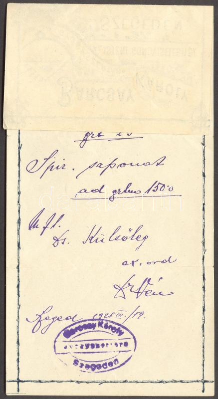 1928 Recept Barcsay Károly szegedi gyógyszertárából https://www.darabanth.com/de/167-Fernauktion/167.0/Andere-Sammelgebiete/Drucksachen~500041/1928-Recept-Barcsay-Karoly-szegedi-gyogyszertarabol~II541302