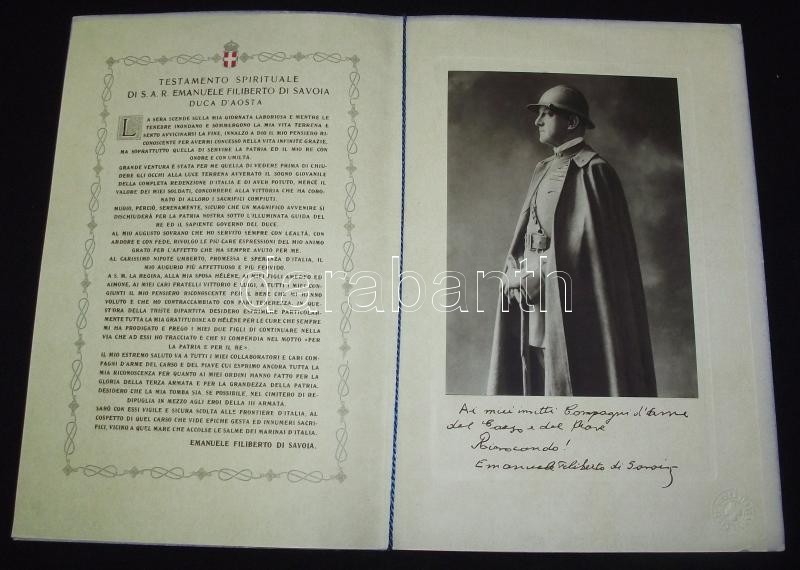 1931 Emanuele Filiberto of Savoy-Aosta olasz tábornok erkölcsi végrend...