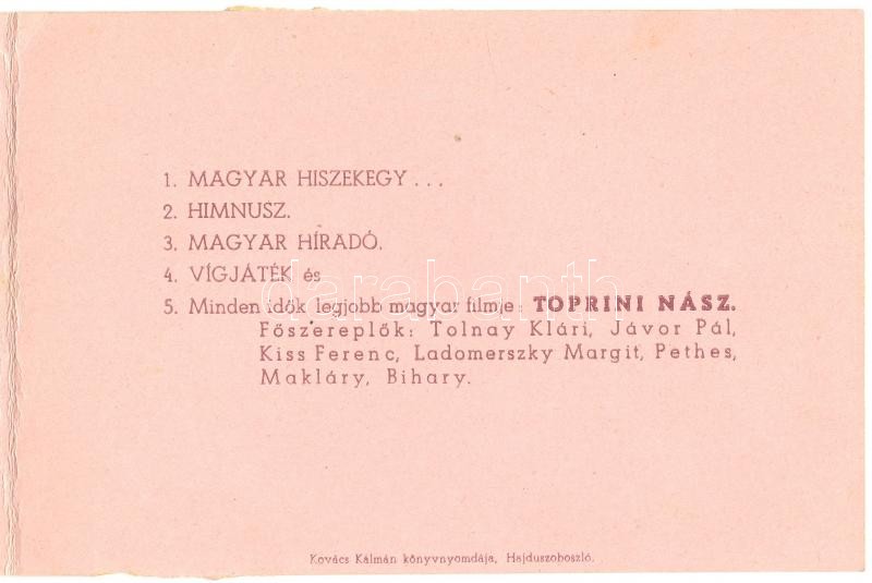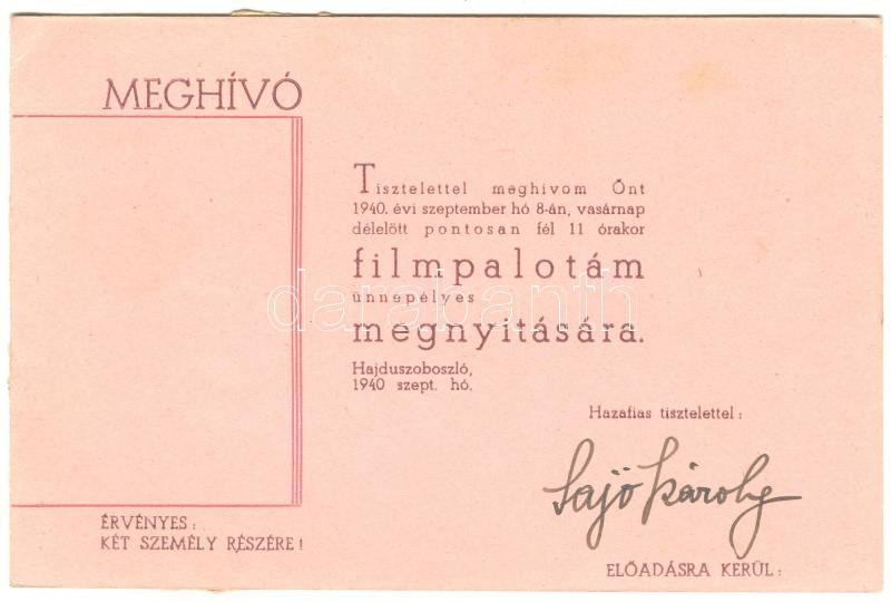 1940 Meghívó Sajó Károly hajduszoboszlói mozijának megnyitására https://www.darabanth.com/de/167-Fernauktion/167.0/Andere-Sammelgebiete/Drucksachen~500041/1940-Meghivo-Sajo-Karoly-hajduszoboszloi-mozijanak-megnyitasara~II560567