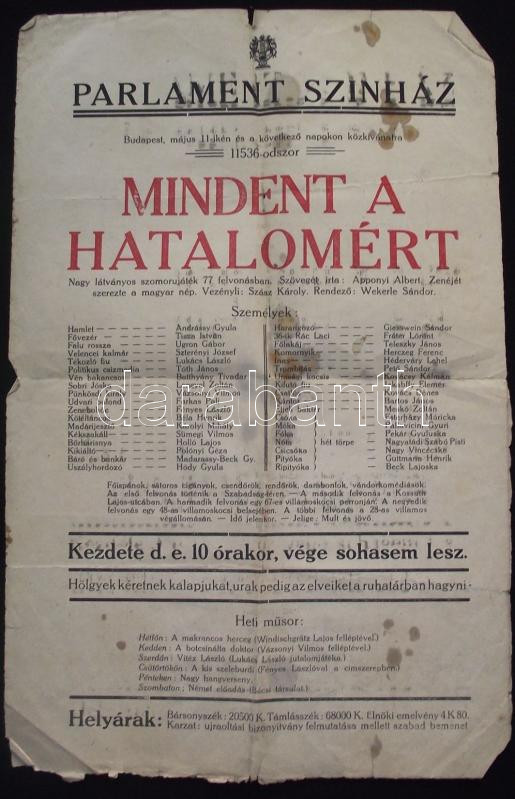 cca 1910 Parlament színház: Mindent a hatalomárt politikai gúnyplakát ... https://www.darabanth.com/de/167-Fernauktion/167.0/Andere-Sammelgebiete/Drucksachen~500041/cca-1910-Parlament-szinhaz-Mindent-a-hatalomart-politikai-gunyplakat-kisse-foltos-23x37-cm~II531300