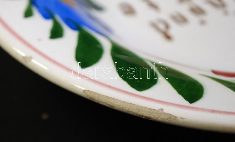 cca 1900 "Jöjjön el a te országod..." és virággal díszített Hollóháza kerámia falitányér, kézzel festett, jelzett (házon a holló), apró lepattogzással, d: 24 cm