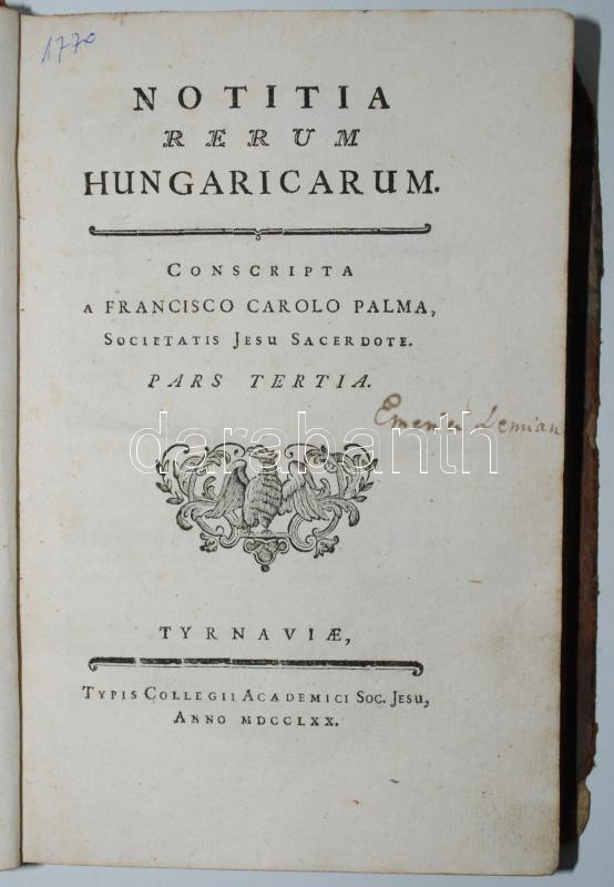 Palma (Károly Ferenc) Carolus Franciscus: Notitia rerum Hungaricum. II... https://www.darabanth.com/de/168-Fernauktion/168.0/Andere-Sammelgebiete/Bucher-Andere-Sprachen~500033/Palma-Karoly-Ferenc-Carolus-Franciscus-Notitia-rerum-Hungaricum-III-kot-Tyrnaviae-1770-Kora~II565170