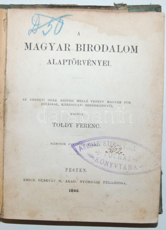 Toldy Ferenc: A magyar birodalom alaptörvényei. Az eredeti deák szöveg mellé vetett magyar fordítással, közjogtani segédkönyvül 2. jav. kiadás. Pest, 1866. Emich. Megviselt félvászon kötásben, kötéstábla elvált, lapok sértetlenek