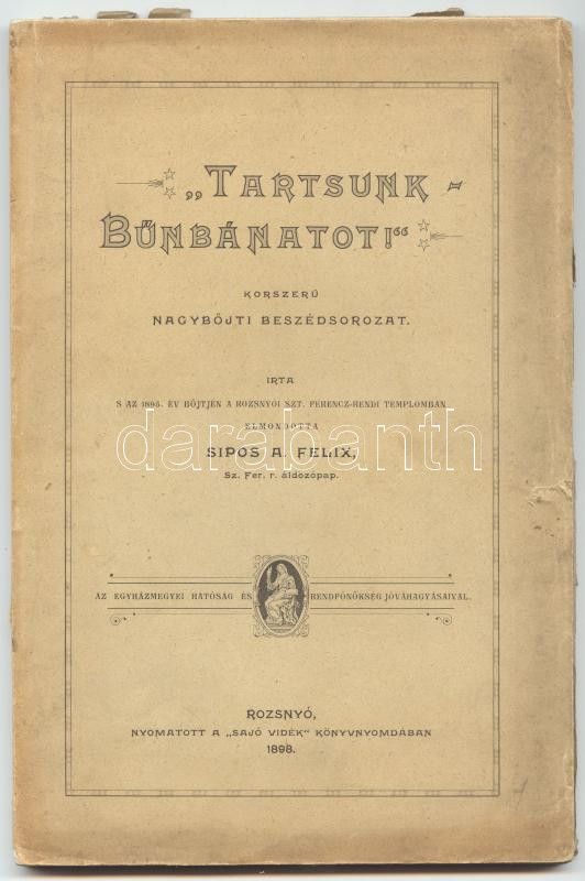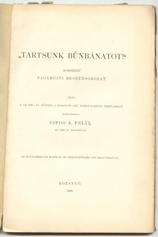 Tartsunk bűnbánatot - Korszerű nagyböjti beszédsorozat, melyet elmondott Sipos A. Felix 1895. év böjtjén a rozsnyói Szt. Ferencz-rendi templomban, nyomatott a "Sajó Vidék" könyvnyomdában, 1898-ban, Rozsnyón