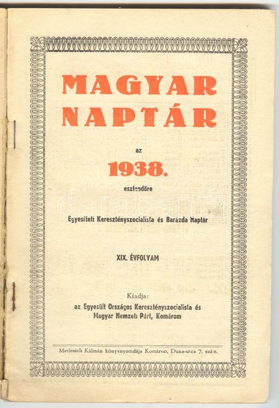 1938 Magyar Naptár, kiadja az Egyesült Orsz. Keresztény Szoc. és Magya... https://www.darabanth.com/de/168-Fernauktion/168.0/Andere-Sammelgebiete/Bucher-Sonstige-Raritaten~500040/1938-Magyar-Naptar-kiadja-az-Egyesult-Orsz-Kereszteny-Szoc-es-Magyar-Nemzeti-Part-Komarom-~II563615