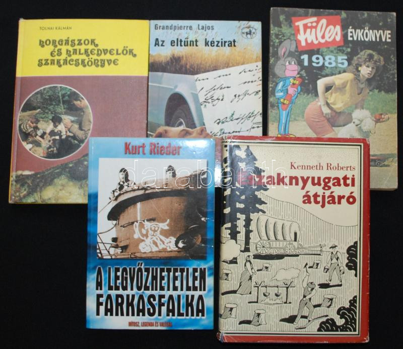 Beschreibung: 5db klf témájú könyv: Füles évkönyv, Horgászok és halkedvelők szakácskönyve, A legyőzhetetlen farkasfalka, Az eltűnt kézirat, Északnyugati átjáró