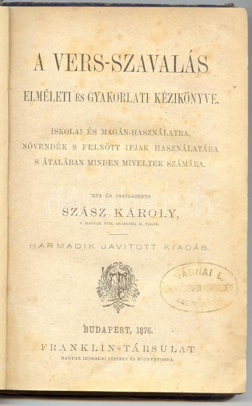 A vers-szavalás elméleti és gyakorlati kézikönyve. Iskolai és magán-használatra, növendék s felnőtt ifjak használatára s általában minden miveltek számára, irta és összeszedte Szasz Károly