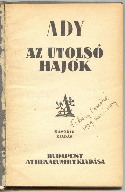 Ady Endre: Utolsó hajók. Bp., én. Athenaeum. Második kiadás. (Kissé sé... https://www.darabanth.com/de/168-Fernauktion/168.0/Andere-Sammelgebiete/Bucher-Sonstige-Raritaten~500040/Ady-Endre-Utolso-hajok-Bp-en-Athenaeum-Masodik-kiadas-Kisse-serult-egeszvaszon-ko~II562464