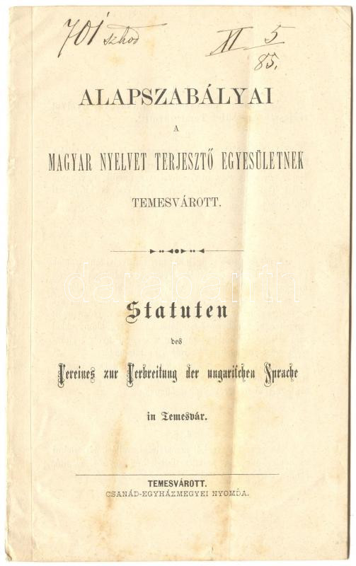 Beschreibung: Alapszabályai a Magyar Nyelvet Terjesztő Egyesületnek Temesvárott, Csanád-egyházmegyei nyomda, 1884, magyar és német nyelven