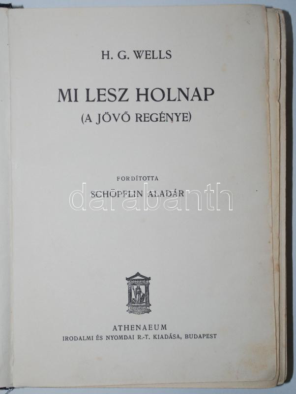 H.G. Wells: Mi lesz holnap (a jövő regénye), Bp., é.n., Atheneum Nyomd... https://www.darabanth.com/de/168-Fernauktion/168.0/Andere-Sammelgebiete/Bucher-Sonstige-Raritaten~500040/HG-Wells-Mi-lesz-holnap-a-jovo-regenye-Bp-en-Atheneum-Nyomda-forditotta-Schopflin-~II562960