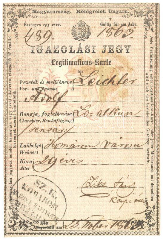 Beschreibung: 1863 Igazolási jegy ló-alkus (sensár) részére