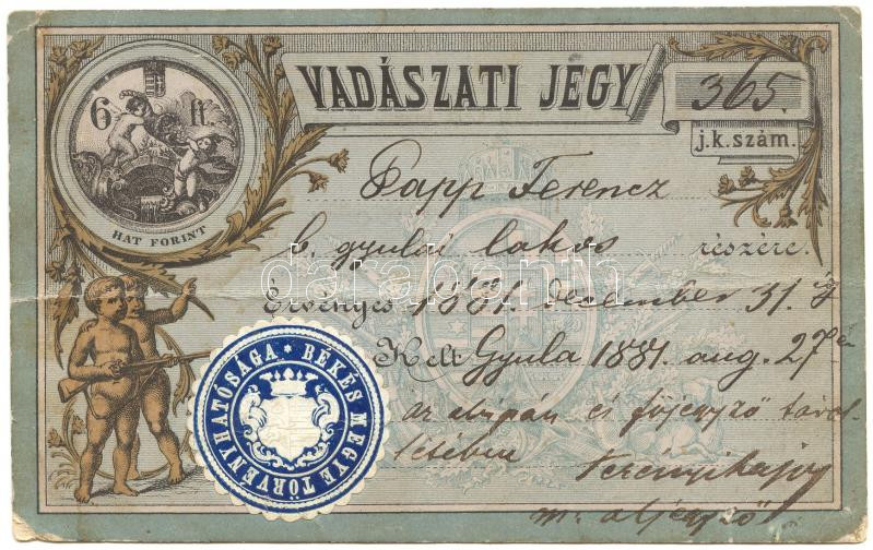 Beschreibung: 1881 Vadászati jegy 6Ft