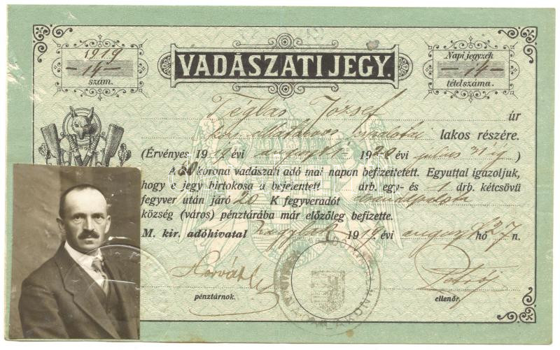 1919 Fényképes vadászati jegy https://www.darabanth.com/de/168-Fernauktion/168.0/Andere-Sammelgebiete/Dokument~500024/1919-Fenykepes-vadaszati-jegy~II560672