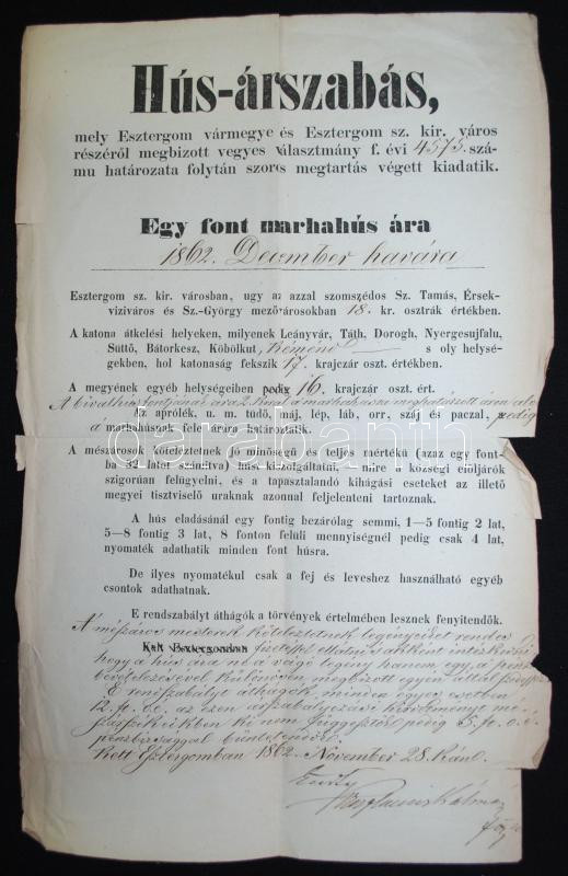 1862 Hús-árszabási hirdetmény Esztergom vármegyére 22x40 cm https://www.darabanth.com/de/168-Fernauktion/168.0/Andere-Sammelgebiete/Drucksachen~2000345/1862-Hus-arszabasi-hirdetmeny-Esztergom-varmegyere-22x40-cm~II565228