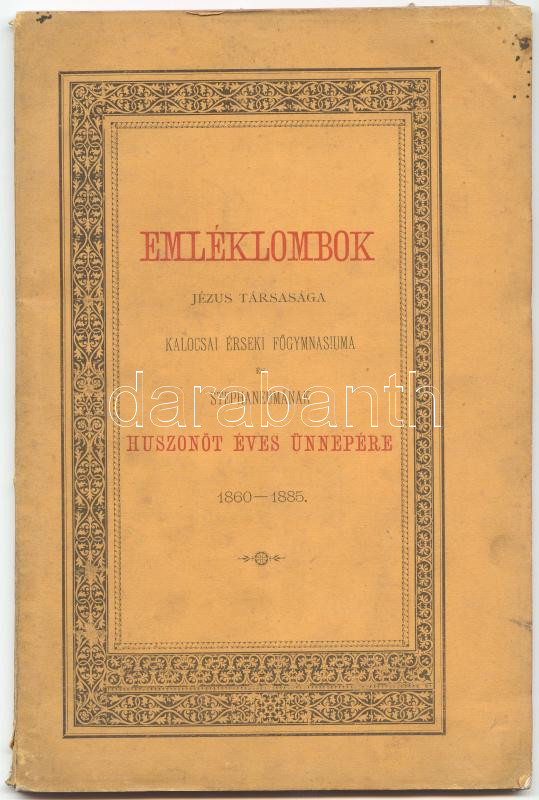 Beschreibung: 1885 Emléklombok-Jézus társasága, Kalocsai Érseki főgymnasiuma és Stephaneumának huszonöt éves ünnepére 1860-1885, kézirat gyanánt az elüljáróság jóváhagyásával, nyomatott Malatin Antalnál Kalocsán