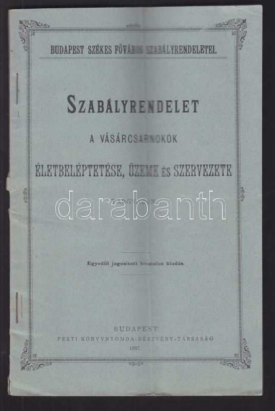 1897 Szabályrendelet a vásárcsarnokok életbeléptetése, üzeme és szerve... https://www.darabanth.com/de/168-Fernauktion/168.0/Andere-Sammelgebiete/Drucksachen~2000345/1897-Szabalyrendelet-a-vasarcsarnokok-eletbeleptetese-uzeme-es-szervezete-targyaban-Bp-~II524486