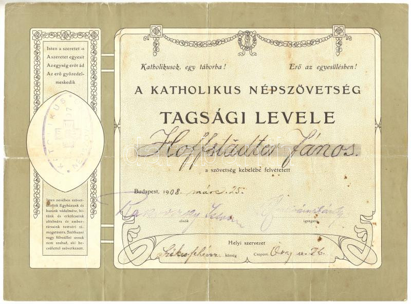 1908. A Katholikus Népszövetség Tagsági Levele https://www.darabanth.com/de/168-Fernauktion/168.0/Andere-Sammelgebiete/Drucksachen~2000345/1908-A-Katholikus-Nepszovetseg-Tagsagi-Levele~II562601