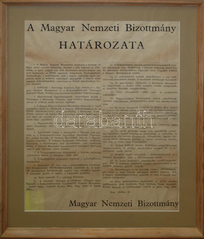 1956 A Magyar Nemzeti Bizottmány Határozata üvegezett keretben (ragasz... https://www.darabanth.com/de/168-Fernauktion/168.0/Andere-Sammelgebiete/Drucksachen~2000345/1956-A-Magyar-Nemzeti-Bizottmany-Hatarozata-uvegezett-keretben-ragasztott-62x50cm~II563098