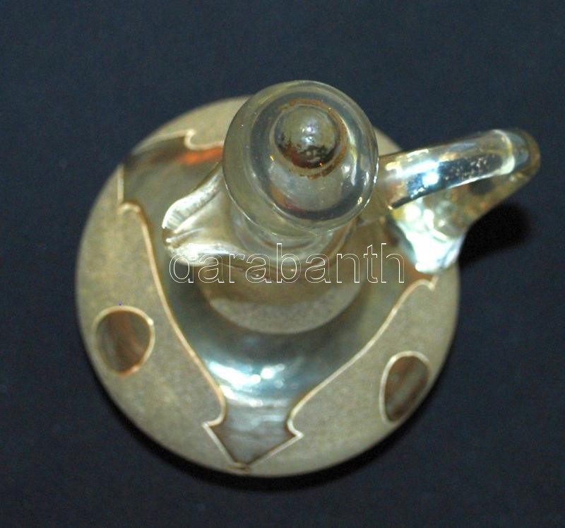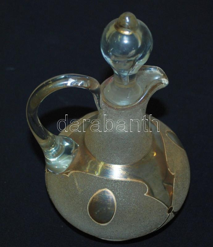Beschreibung: Cca 1930, kecses homok-fújt üveg kiöntő, csiszolt dugóval, kis repedés a nyakánál