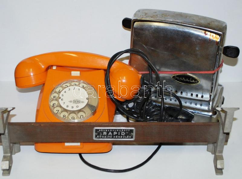Beschreibung: Kis bolha tétel: régi Supralec kenyérpirító, tárc sás telefon és egy szabadalmazott "RAPID" rögzítő készülék