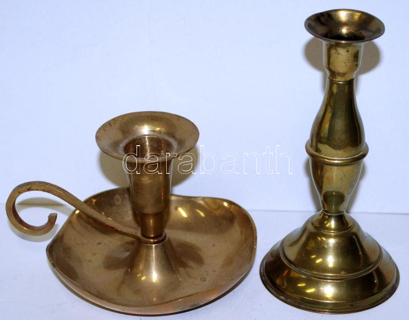 Beschreibung: Kis gyertyatartó tétel: réz gyertyatartó fogantyúval, d:12 cm, m:14 cm, kis gyertyatartó m:14 cm, jó állapotban