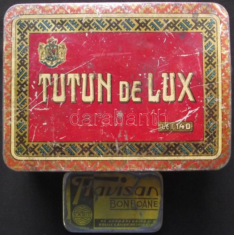 Beschreibung: cca 1930 2 db román festett fém doboz: dohány 14x19 cm, Bonbon 10x6 cm / 2 Romanian metal boxes with commercial