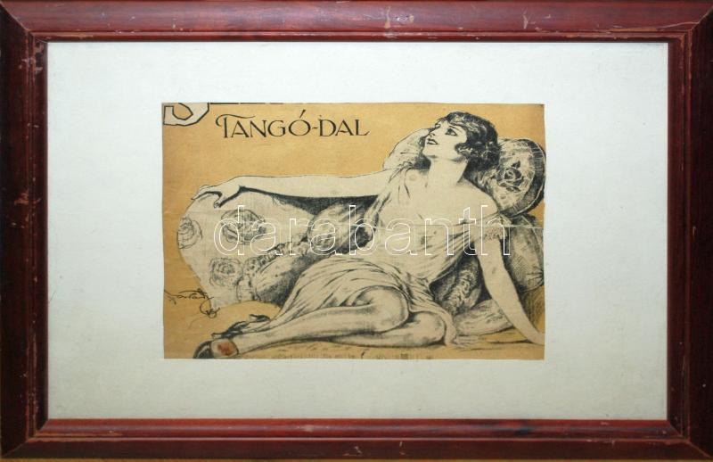 Beschreibung: Faragó jelzéssel: Tangó-dal, lithográfia (plakátrészlet), üvegezett keretben, 35x45cm (sérült!)
