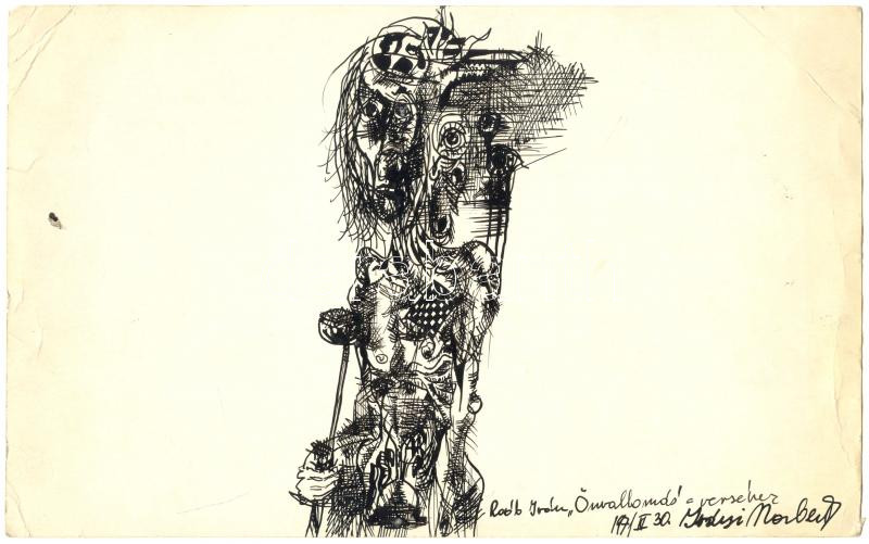 Iványi Norbert (1953-2001): Önvallomás, tus, papír jelzett ajánlással, 1971-es !!!, 16×25 cm. A magyar underground egyik méltatlanul elfelejtett alakja. A képzőművészeti főiskola után, a Kontroll Csoport alapító tagja volt. Külföldön ért el nagy sikereket.