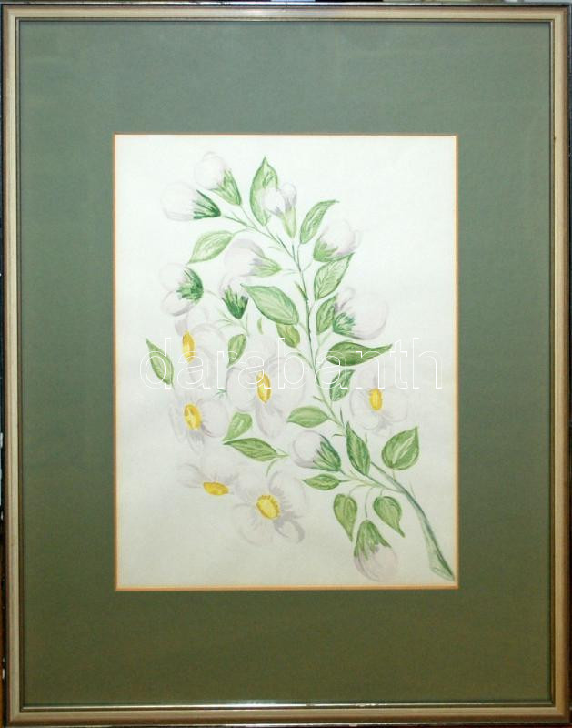 Beschreibung: Jelzés nélkül: Virágzó ág, akvarell, papír, üvegezett keretben, 40×50 cm