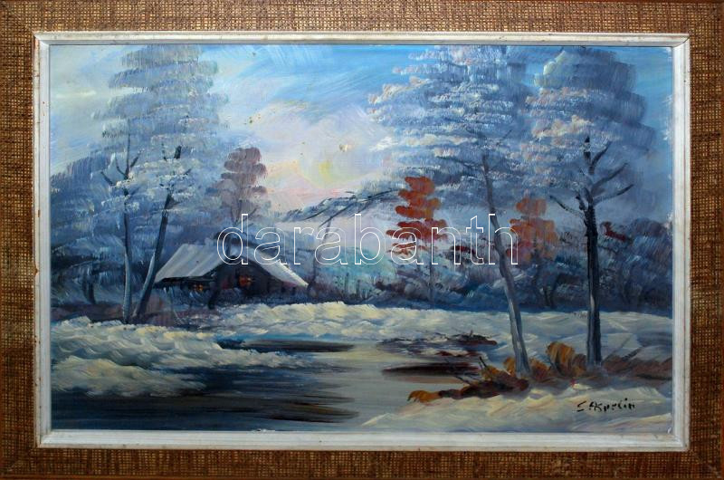 Stig Aspelin (1911-1990): Téli táj kunyhóval, olaj, olaj, farost, jelzett, 55×75 cm kerettel. Ismert svéd festő, aki több aukción is szerepelt hazájában.