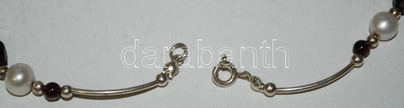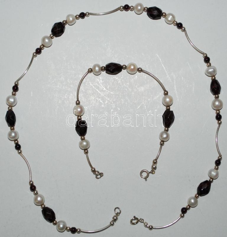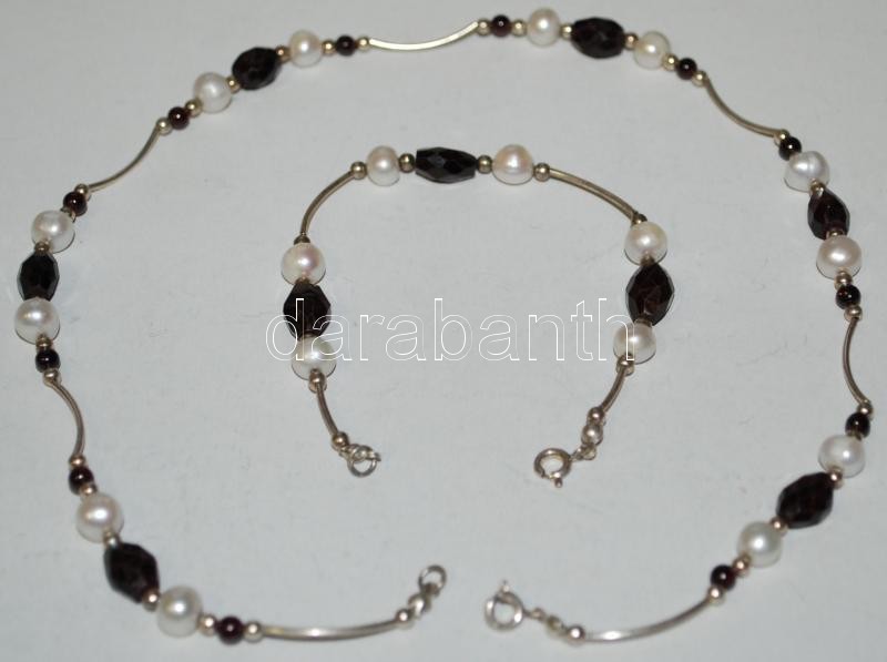 Ezüst (Ag) nyaklánc hozzávaló karkötővel, csiszolt gránáttal és tenyésztett gyönggyel díszítve /