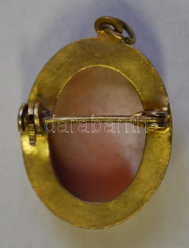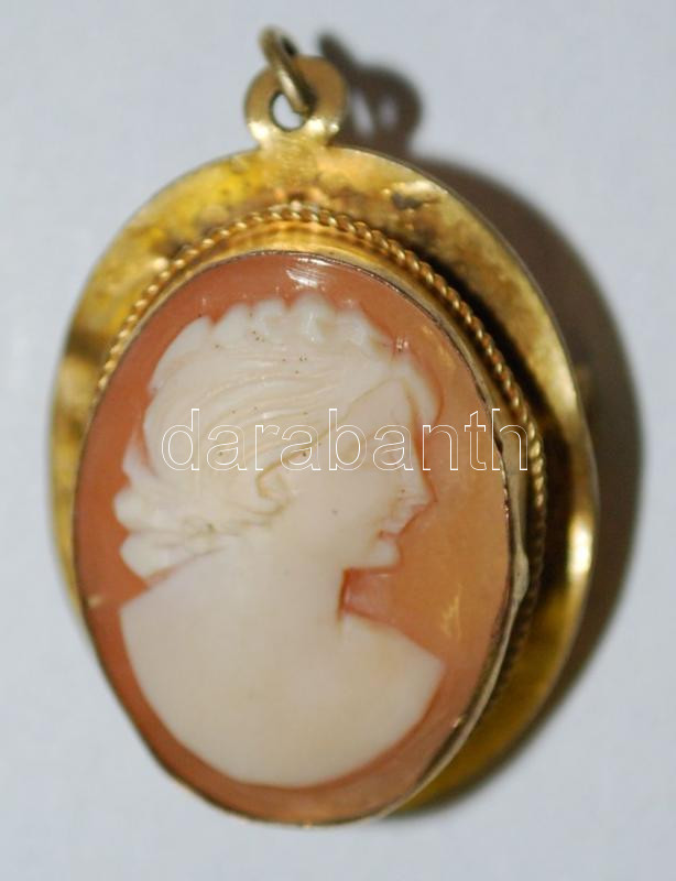 Női bross/medál 14 K arany, sima foglalású óvális cameával díszített, ... https://www.darabanth.com/de/168-Fernauktion/168.0/Andere-Sammelgebiete/Juwelen~2000367/Noi-brossmedal-14-K-arany-sima-foglalasu-ovalis-cameaval-diszitett-1930-korul-jelzes~II564044