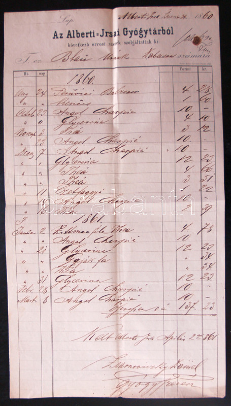 1860 Albertirsai gyógyszertári számla / Pharmacy invoice https://www.darabanth.com/de/168-Fernauktion/168.0/Andere-Sammelgebiete/Werbungen~500032/1860-Albertirsai-gyogyszertari-szamla--Pharmacy-invoice~II524499