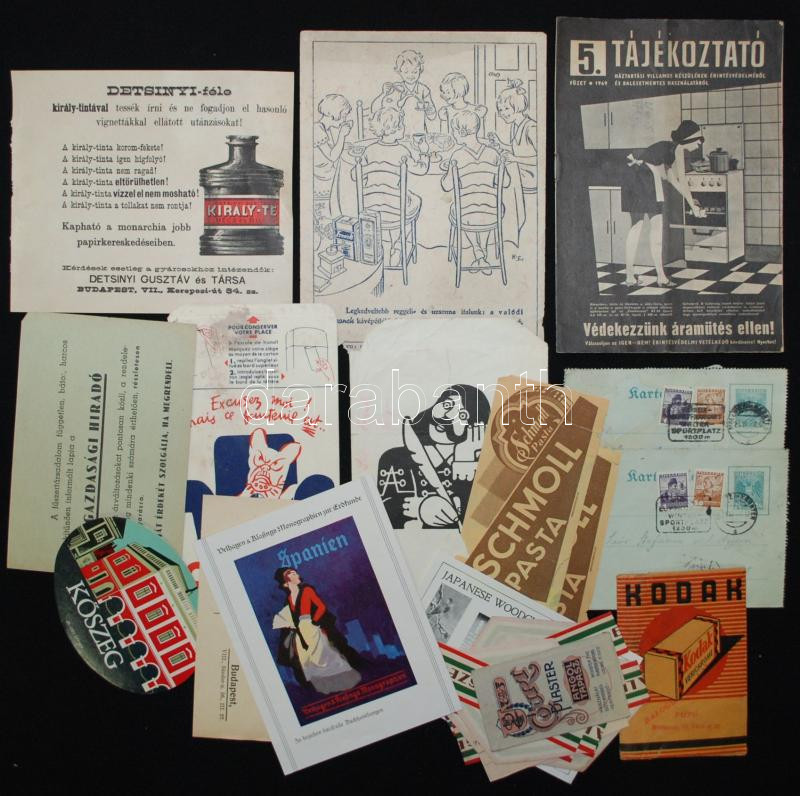 Beschreibung: 20 db vegyes háború előtti reklámnyomtatvány, részben színes szórólap