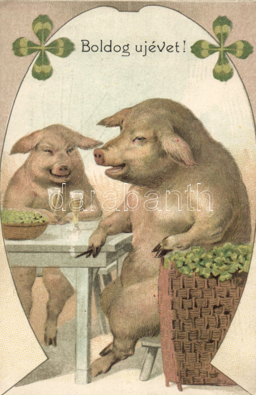 New Year, pig, clover, cigarette, champagne, litho (EK) https://www.darabanth.com/de/168-Fernauktion/168.0/Ansichtskarten/GruC39Fkarte~2000336/New-Year-pig-clover-cigarette-champagne-litho-EK~II565573