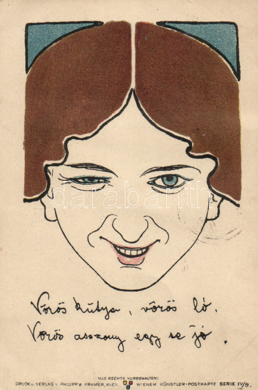 1898 Vörös kutya, vörös ló, vörös asszony egy se jó, humour, Philipp &... https://www.darabanth.com/de/168-Fernauktion/168.0/Ansichtskarten/Kunstler~2000325/1898-Voros-kutya-voros-lo-voros-asszony-egy-se-jo-humour-Philipp-Kramer~II561173