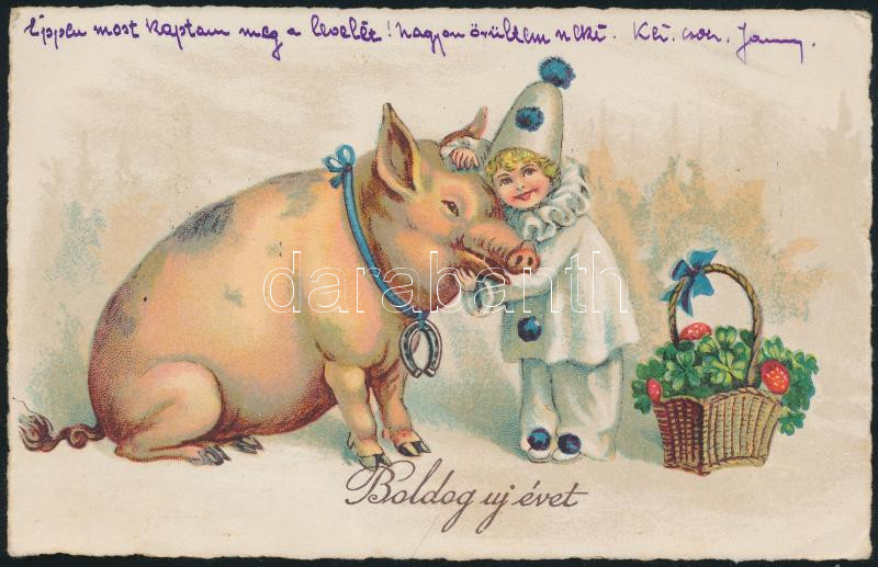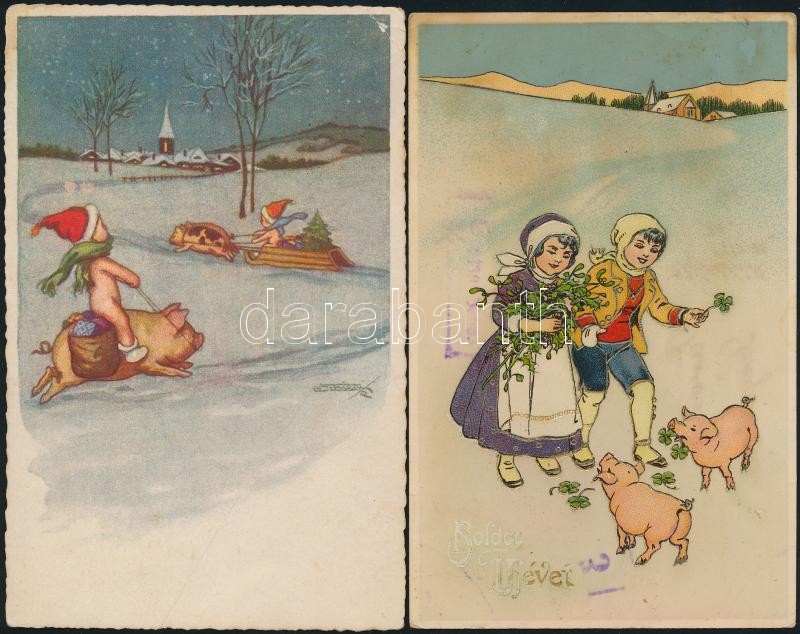 3 db háború előtti, újévi üdvözlőlap szerencsemalaccal, köztük két lit... https://www.darabanth.com/de/168-Fernauktion/168.0/Ansichtskarten/Postkarten~2000253/3-db-haboru-elotti-ujevi-udvozlolap-szerencsemalaccal-koztuk-ket-litho~II562661