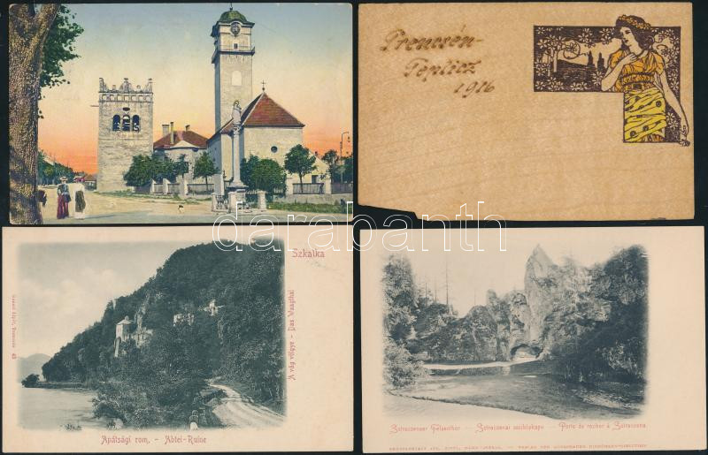 Beschreibung: 4 db régi, felvidéki városképes lap, az egyik fából készült