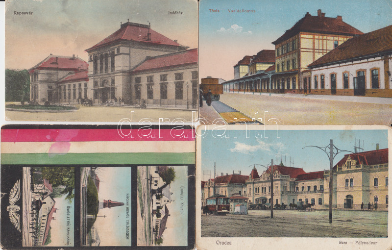 Beschreibung: 4 db régi városképes lap, vasútállomások a történelmi Magyarország területéről,